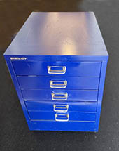 Blauer Metallkorpus3 grosse und 1 kleine SchubladeHöhe mit Sockel: 67 cmBreite: 35 cmTiefe: 46 cmFr. 20.-